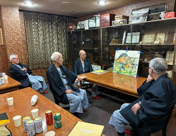 夕食後は別室で写生した絵を持ち寄って合評会を行いました。進行役を牧野さんが行い、長谷部さんのキャンパス油絵を始めに、森さん、奥野さん、江澤さんのスケッチ他、お互いに評論し合い、楽しい有意義な時間でした。